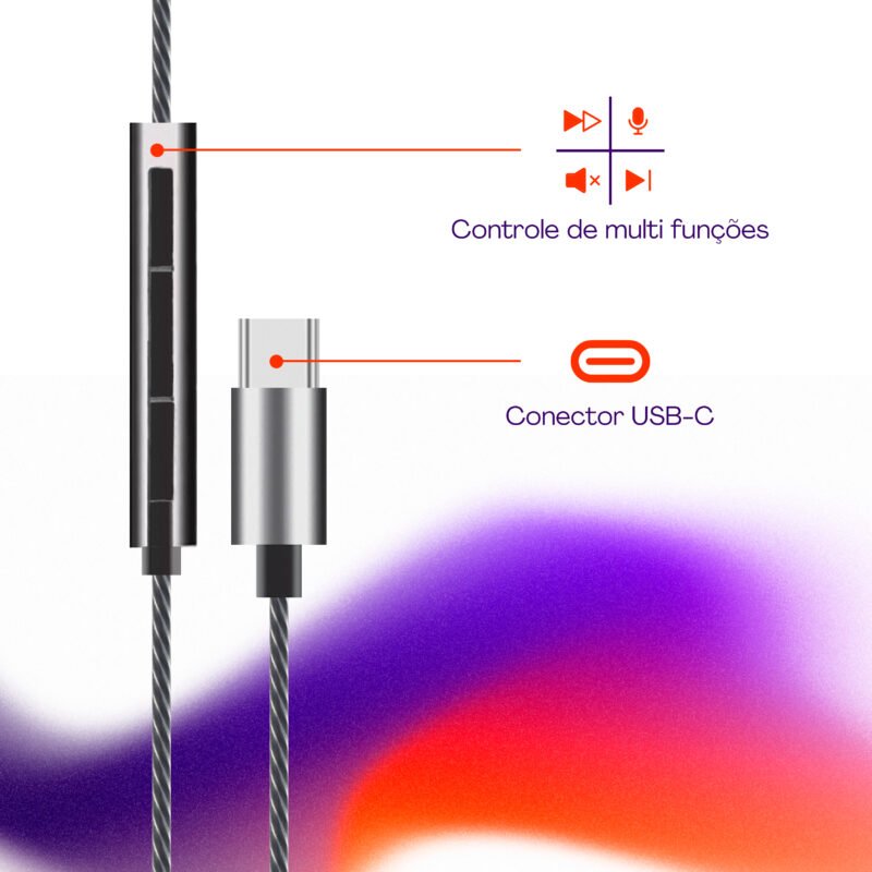 Além do cabo de 2 metros, o botão de controle acoplado nele, facilita controlar o volume dos fones, bem como silenciar o microfone e o audio.